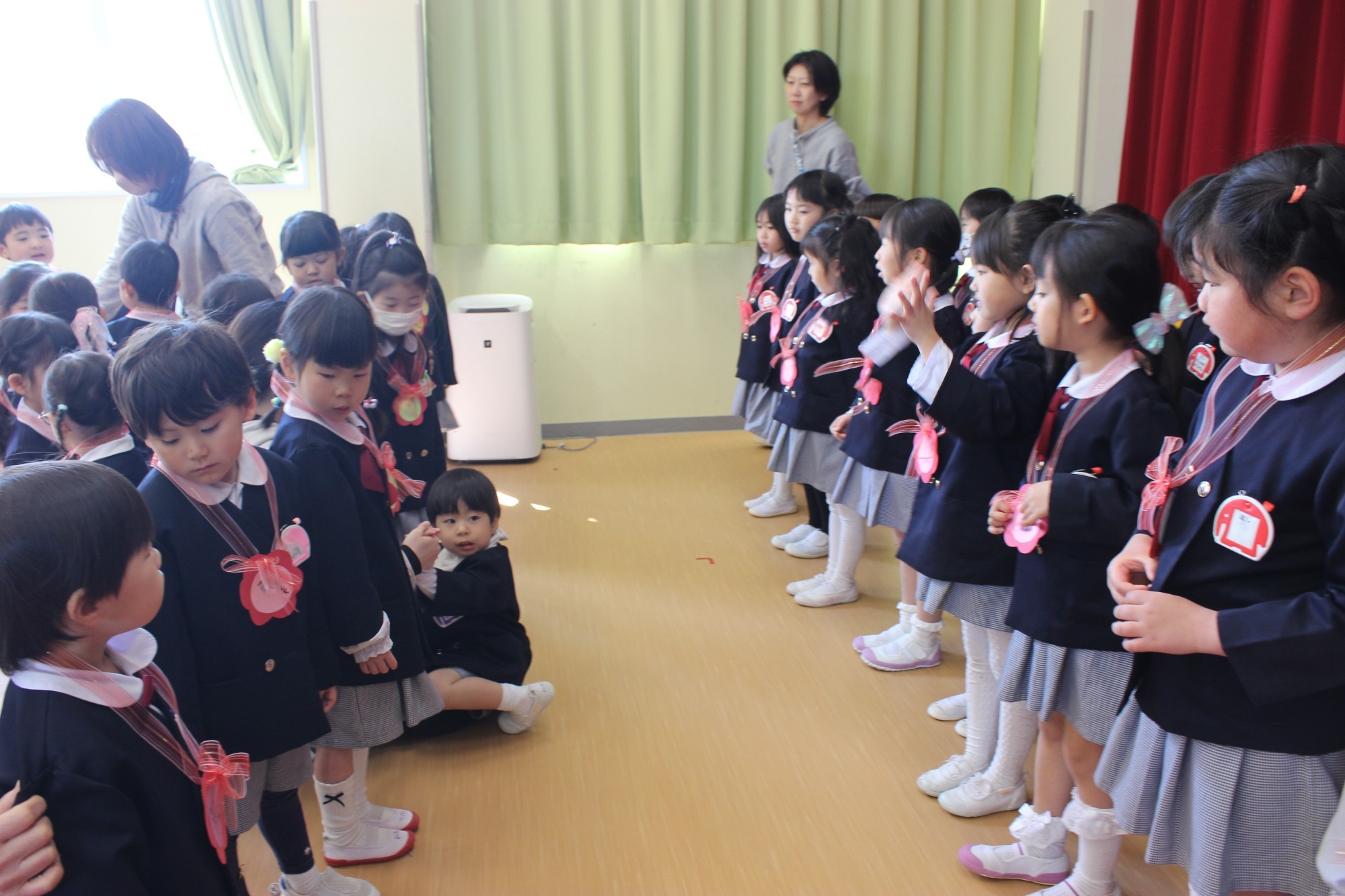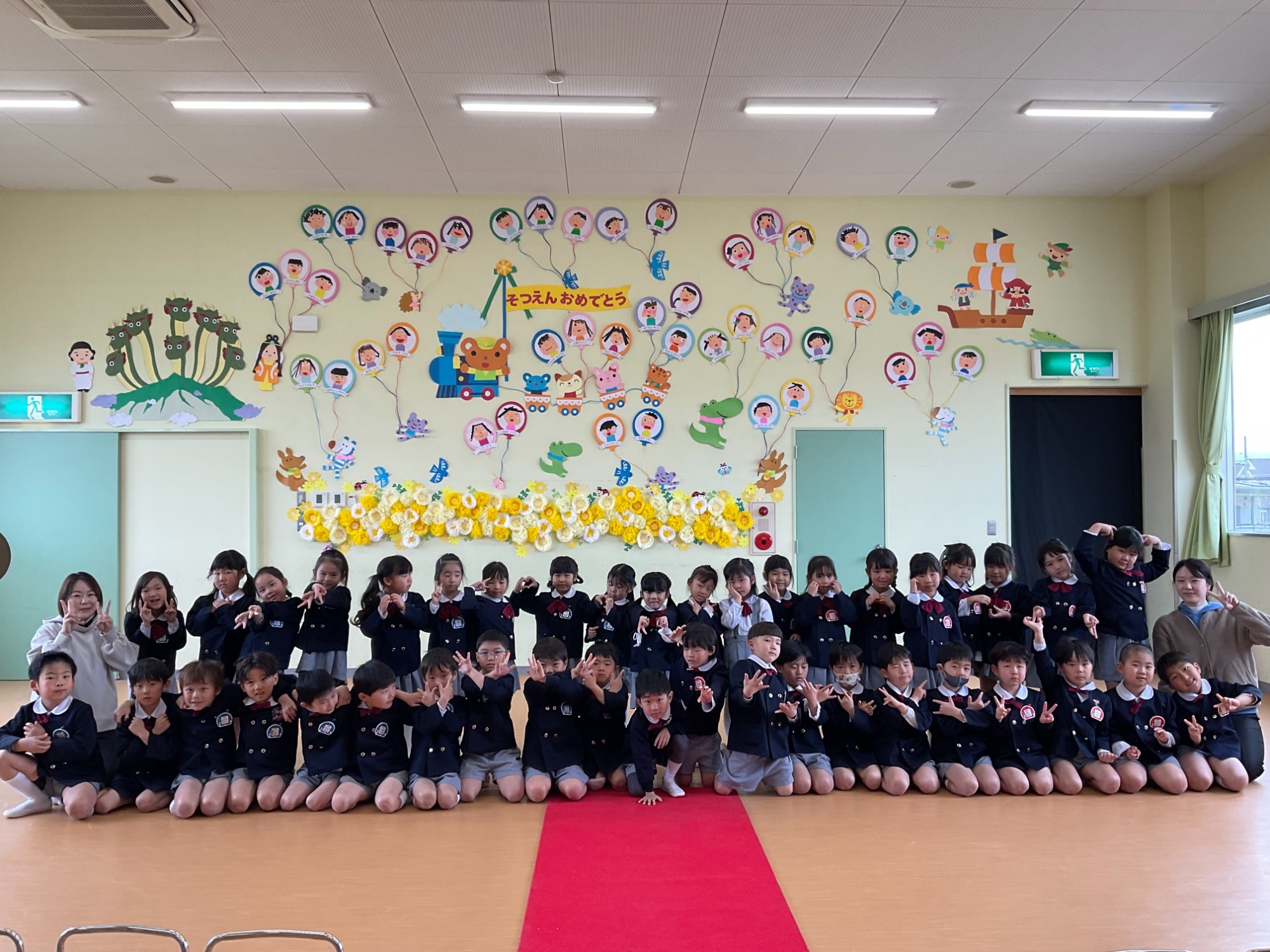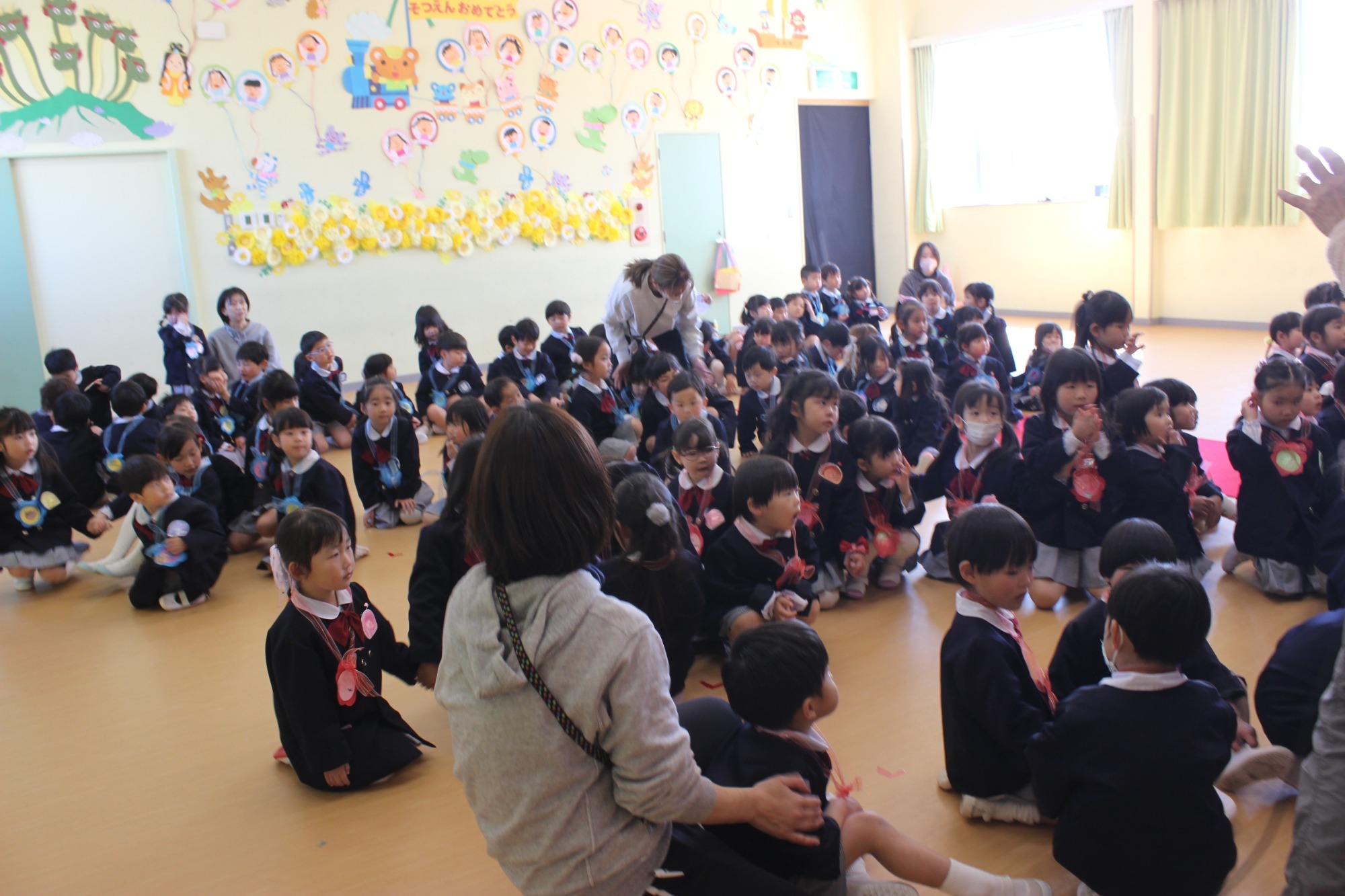 始業式(4/8)いよいよ新学期がスタートしました。年長・年中組はお遊戯室、年少組はお部屋で始業式をおこないました。