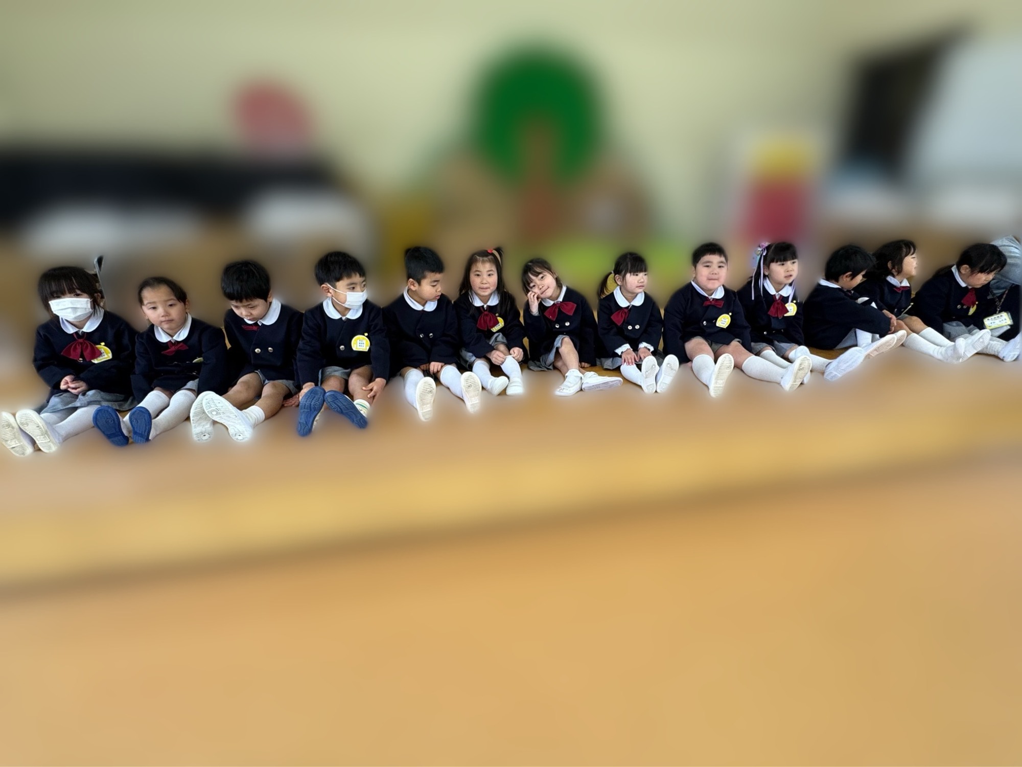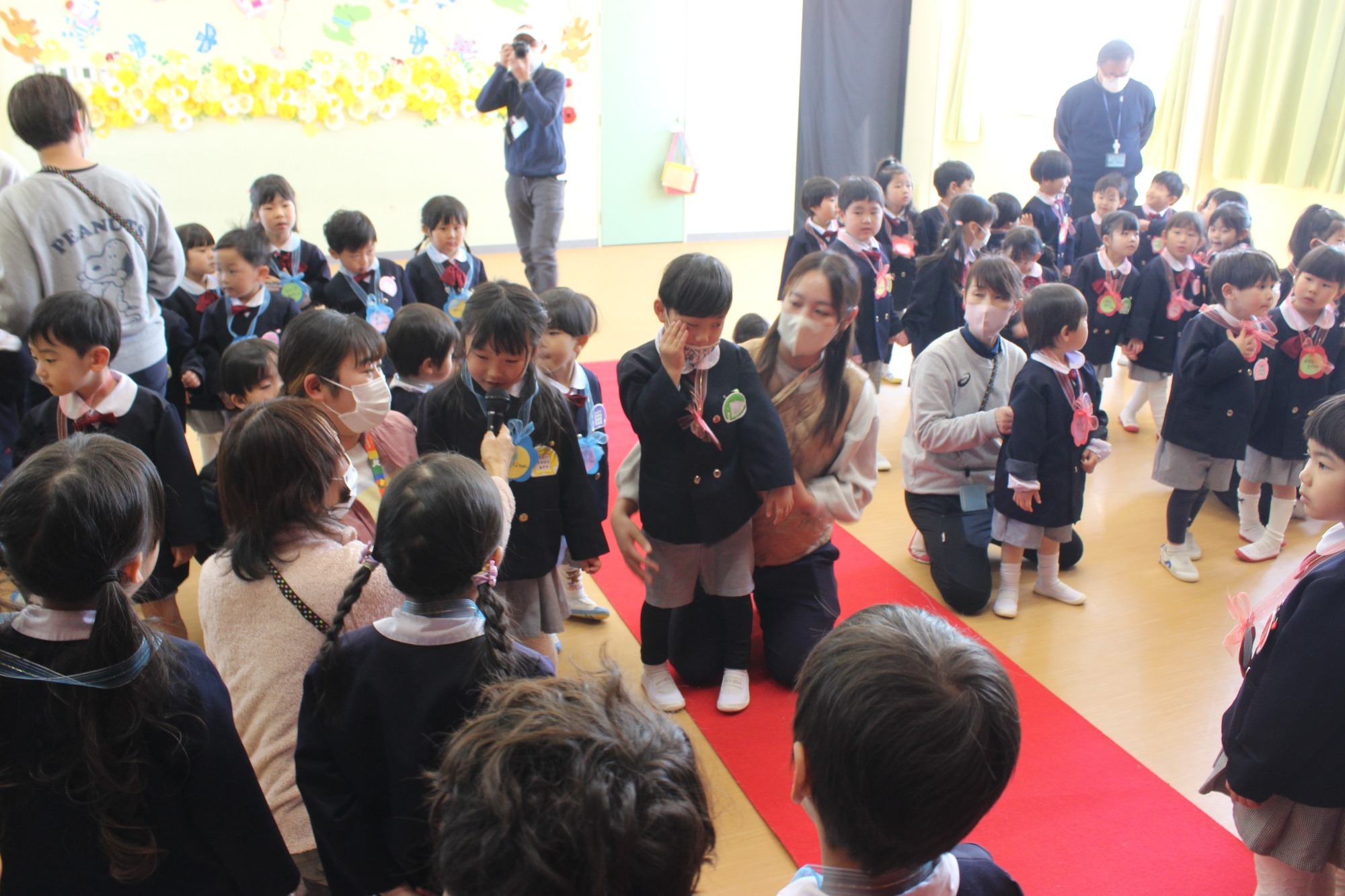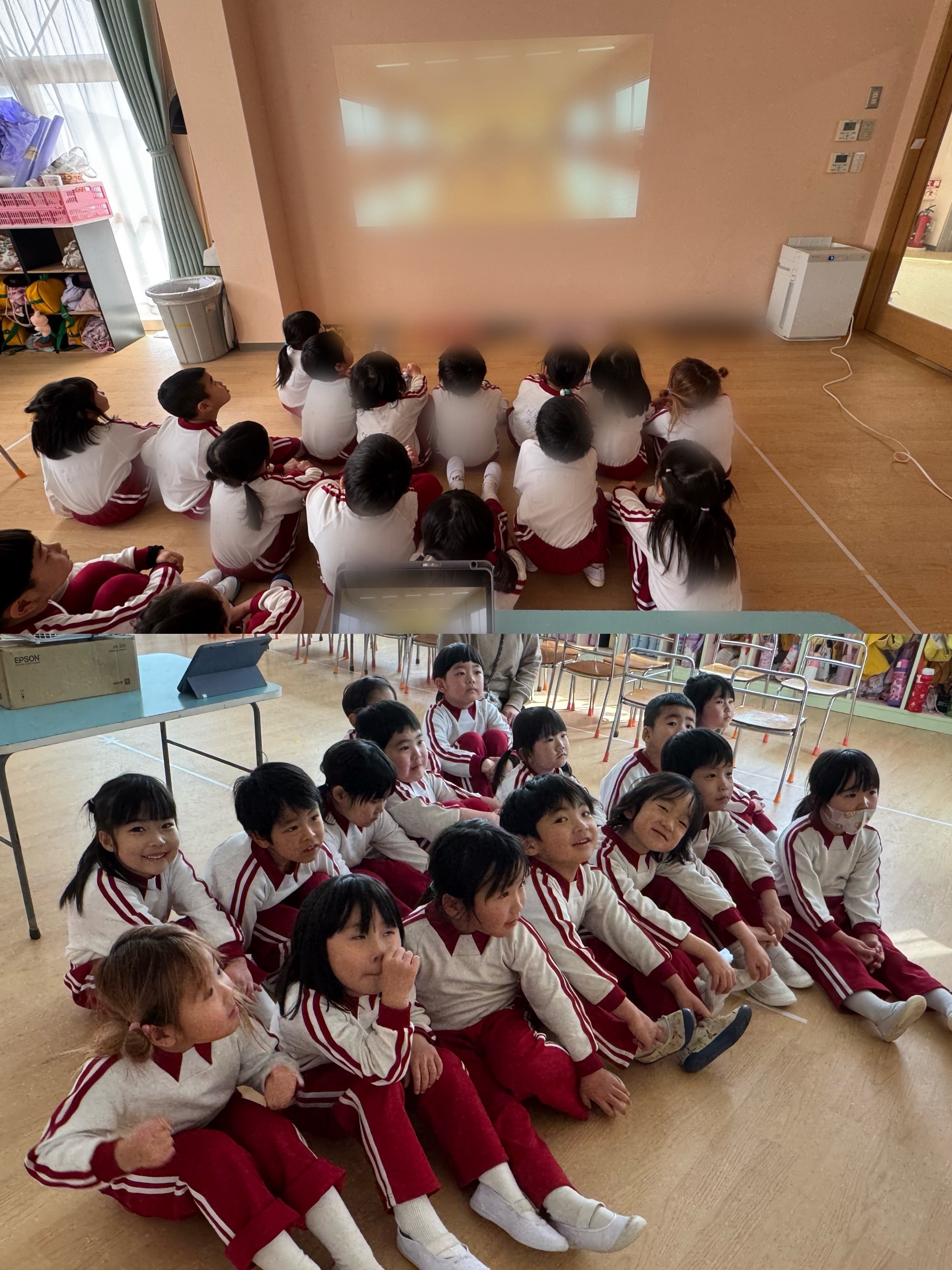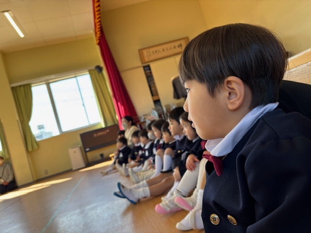 始業式(4/8)いよいよ新学期がスタートしました。年長・年中組はお遊戯室、年少組はお部屋で始業式をおこないました。