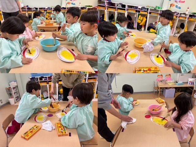 年少 はじめて絵の具を使ったよー‼️お楽しみにー🧡